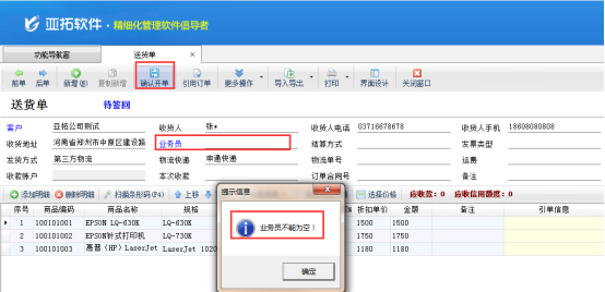 以送貨單軟件為例,示范下如果設(shè)置開單業(yè)務(wù)員允許為空。軟件安裝完成,系統(tǒng)參數(shù)設(shè)置默認(rèn)業(yè)務(wù)員不允許為空,正常開送貨單,未在單據(jù)主體中輸入“業(yè)務(wù)員”,商品輸入完成后點(diǎn)擊確認(rèn)開單按鈕,會(huì)提示“業(yè)務(wù)員不能為空”,如下圖1所示: