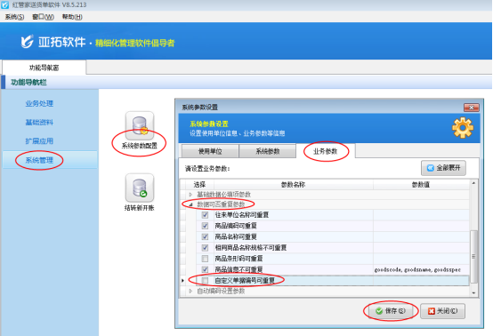 以紅管家送貨單軟件為例,在“系統(tǒng)管理”—》“系統(tǒng)參數(shù)配置”—》“業(yè)務(wù)參數(shù)”內(nèi)將“數(shù)據(jù)可否重復(fù)參數(shù)”中的“自定義單據(jù)編號可重復(fù)”參數(shù)的勾選取消,然后保存設(shè)置。如下圖1所示: