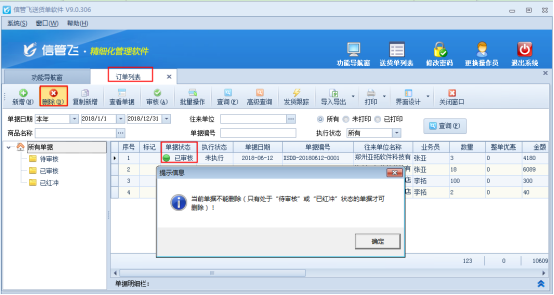 信管飛送貨單軟件、信管飛RMS軟件等支持開銷售單之前先開訂單。銷售單可以引用訂單進行開單。對于剛下訂單出錯或者取消訂單的,軟件支持刪除訂單操作。以信管飛送貨單軟件為例,示范下如何刪除已審核的訂單單據(jù)?