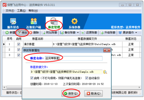 以“信管飛送貨單軟件”為例,示范下如何修改賬套的名稱。打開紅色的應用中心程序(應用中心運行后桌面右下角會顯示相應的圖標,點擊即可打開應用中心主界面),在賬套管理界面,點擊賬套后選擇工具欄中的“修改”按鈕,彈出“修改賬套屬性”界面,把“演示賬套”修改為“送貨單賬套”,然后點擊“保存”按鈕,如下圖1所示: