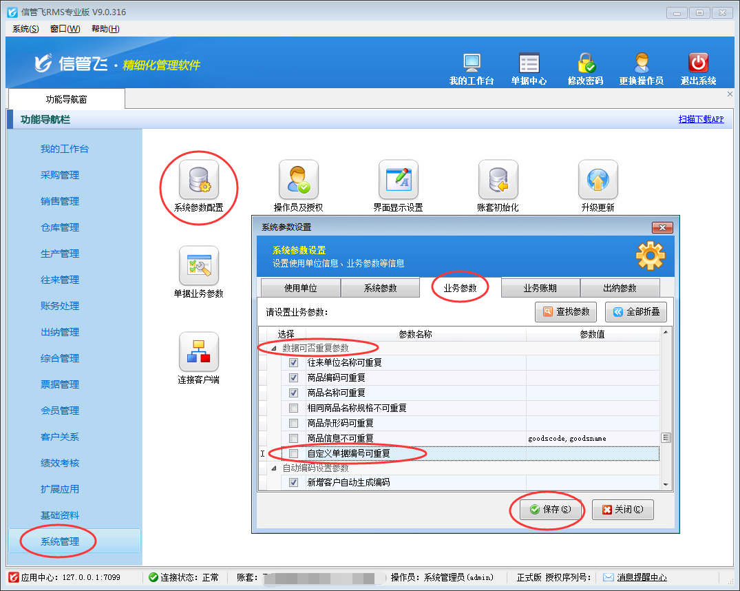 以信管飛RMS為例,在“系統管理”—》“系統參數配置”—》“業務參數”內將“數據可否重復參數”中的“自定義單據編號可重復”參數的勾選取消,然后保存設置。如下圖1所示: