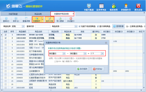 在批量維護商品信息界面,修改價格需要在批量模式下進行操作。點擊“批量操作”按鈕進入批量操作模式,可以勾選部分商品或者全選商品進行修改,本次勾選商品“EPSON LQ-630K、EPSON針式打印機”為例,勾選后點擊修改價格,彈出“批量修改價格”界面,修改此商品的預設售價=預設售價*1.5,如下圖2所示: