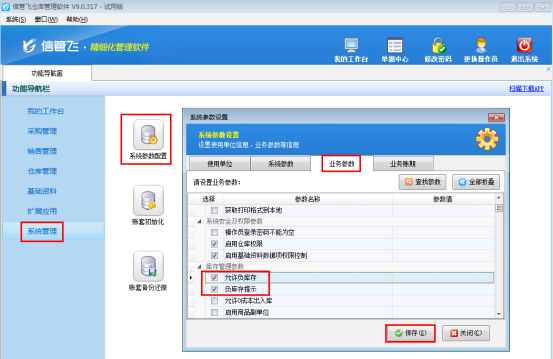 在功能導航窗點擊“系統管理”—》“系統參數配置”—》“業務參數”,即可進入到“業務參數”配置界面,在庫存管理參數內找到“允許負庫存”、“負庫存提示”參數,勾選這兩個參數,然后保存,如下圖1所示: