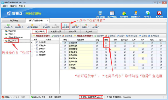 如果需要操作員不可刪除送貨單,軟件也支持設置操作員不可刪除送貨單權限,下面以來演示一下設置操作員不可刪除送貨單權限的操作步驟。