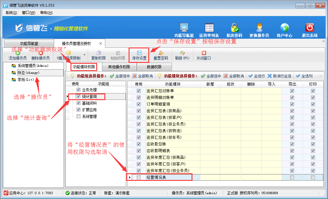 送貨單軟件內如何設置操作員不可查看經營情況表?