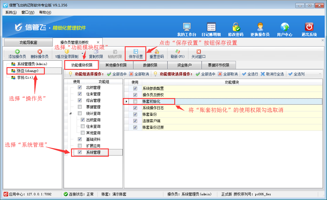 登錄軟件,在功能導航窗點擊“系統管理”—》“操作員及授權”,進入“操作員管理及授權”界面,選擇操作員“張亞”,在其右側的功能模塊權限內選擇“系統管理”模塊,將賬套初始化的“使用”權限勾選取消,然后保存設置,如下圖所示。