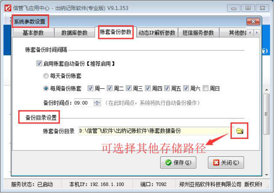 本文以信管飛出納記賬軟件專業(yè)版為例,演示下如何修改賬套備份存儲目錄,打開應(yīng)用中心程序(紅色圖標),點擊“系統(tǒng)參數(shù)”進入?yún)?shù)設(shè)置界面,選擇“賬套備份參數(shù)”,在賬套備份目錄設(shè)置中,可以修改默認目錄,如下圖1所示: