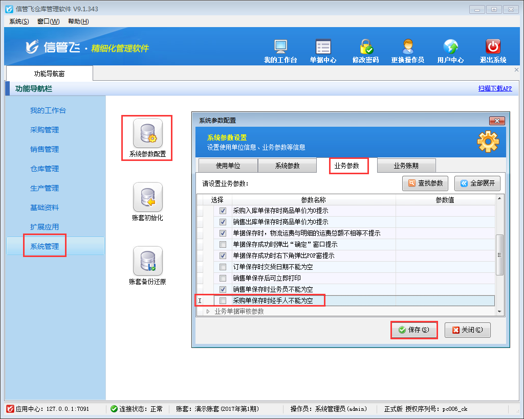 在功能導(dǎo)航窗中點(diǎn)擊“系統(tǒng)管理”—》“系統(tǒng)參數(shù)配置”,即可進(jìn)入“系統(tǒng)參數(shù)設(shè)置”界面,點(diǎn)擊“業(yè)務(wù)參數(shù)”,如圖1所示,在業(yè)務(wù)單據(jù)保存參數(shù)內(nèi)找到“采購單保存時經(jīng)手人不能為空”參數(shù),把這個參數(shù)的勾選去掉,然后保存。