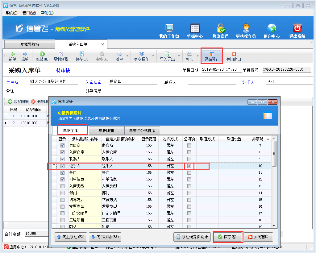 參數(shù)保存后,在功能導(dǎo)航窗點(diǎn)擊“采購管理”—》“采購入庫單”,新增采購入庫單,如果未輸入經(jīng)手人保存單據(jù)時仍提示“數(shù)據(jù)項(xiàng)[經(jīng)手人]不能為空,請輸入!”,可檢查下開單界面的“界面設(shè)計(jì)—》單據(jù)主體”中經(jīng)手人數(shù)據(jù)項(xiàng)是否勾選為必填項(xiàng),如勾選可取消勾選保存配置,如下圖2所示: