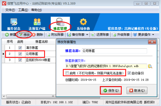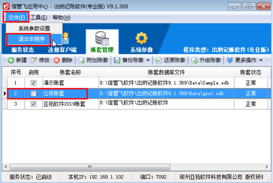 亞拓軟件旗下的信管飛RMS、信管飛倉庫管理軟件、信管飛送貨單軟件、信管飛出納記賬軟件信管飛票據打印軟件等軟件程序安裝后會顯示兩個圖標,一個是應用中心程序(紅色圖標),一個是客戶端程序(藍色圖標)。這些軟件都含有賬套管理功能,在應用中心里面可以建立多個賬套,已使用的帳套如果不再繼續使用,可以停用帳套,停用帳套后,客戶端程序登錄時無法連接該帳套。我們以信管飛出納記賬軟件專業版為例演示一下如何停用帳套。