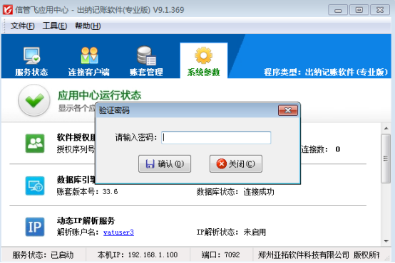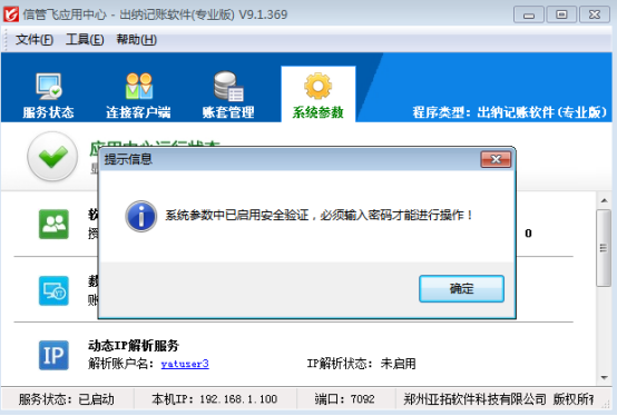 應用中心的管理和配置會對軟件的運行產生重大影響,因此軟件提供增強安全驗證功能,啟用安全驗證后執行賬套管理、系統參數設置等功能時會要求輸入密碼,驗證密碼通過后才可以進行相應操作。下面我們以信管飛出納記賬軟件應用中心為例詳細介紹下如何啟用安全驗證功能。