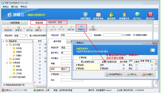 新開送貨單界面單據明細欄默認顯示內容沒有型號,本文以“信管飛送貨單軟件”為例,示范下在開單界面如何顯示出商品的擴展信息內容。