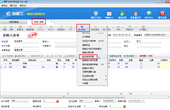 發票管理為擴展模塊,只有信管飛RMS標準版和專業版支持附加使用。填開發票除了在發票管理中直接進行新增,軟件也支持在開單界面直接填開發票操作。本文以信管飛RMS專業版的采購入庫單為例,講一下在采購入庫單中如何快速填開發票操作。