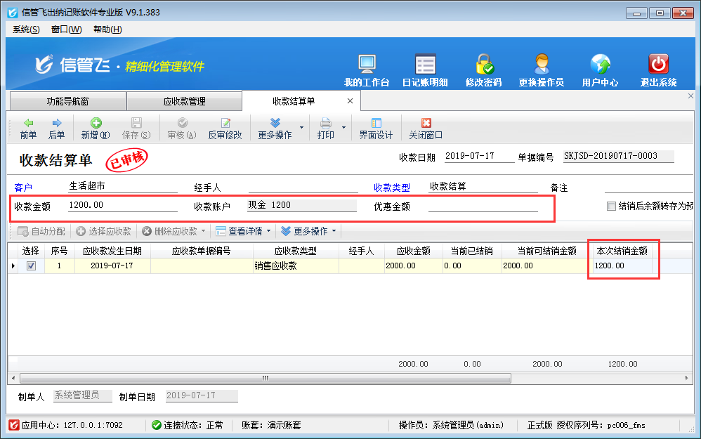 在應收款管理界面點擊“收款結算”按鈕可以打開收款結算單對應收款進行收款結算,如下圖所示,在收款結算單單據主體選擇收款賬戶后錄入“收款金額”1200元,單據明細中“本次結銷金額”錄入1200元,保存并審核收款結算單即可。
