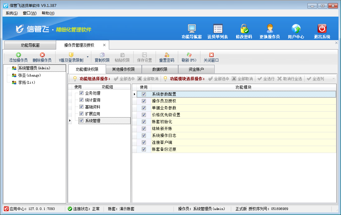 設(shè)置操作員權(quán)限:操作員賬號(hào)添加后,請(qǐng)選中操作員賬號(hào),然后在其右側(cè)可以設(shè)置操作員可操作的功能模塊權(quán)限、數(shù)據(jù)權(quán)限及其他操作權(quán)限。設(shè)置功能模塊權(quán)限的時(shí)候,注意功能模塊權(quán)限打勾選擇“使用”后,還需要設(shè)置詳細(xì)的操作權(quán)限(如新增、刪除、審核、反審修改、紅沖、導(dǎo)入、導(dǎo)出、打印等),如果不設(shè)置詳細(xì)的模塊操作權(quán)限,則只能進(jìn)入功能模塊,但無(wú)法執(zhí)行任何操作。