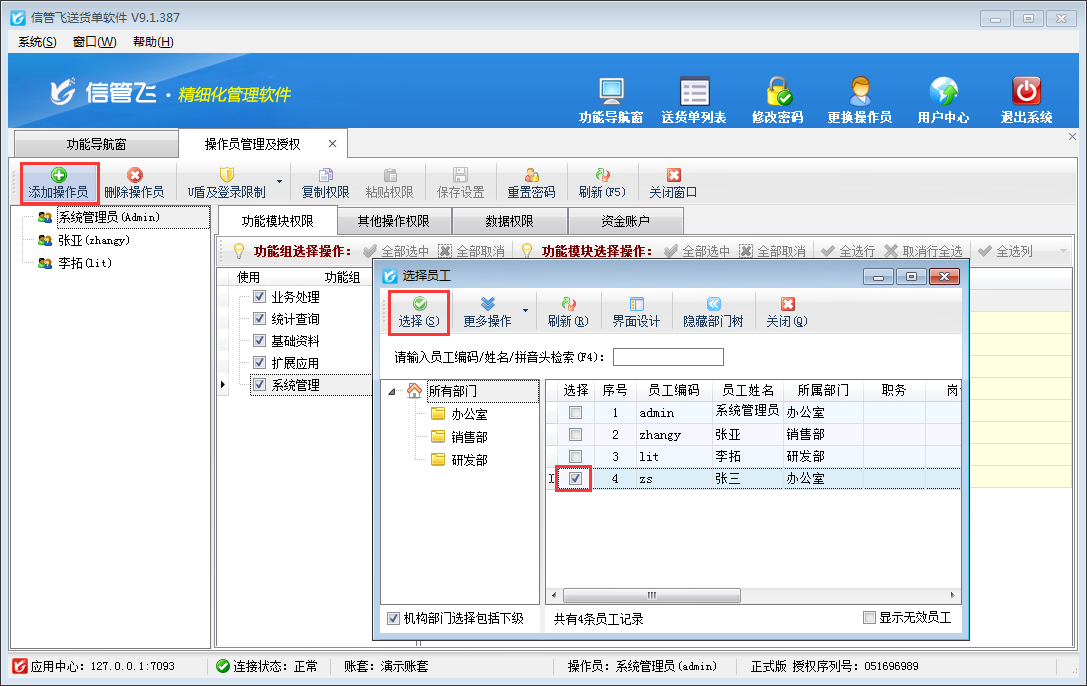添加操作員:可以將“員工信息”中的員工設(shè)置為操作員,支持批量設(shè)置。點(diǎn)擊“添加操作員”按鈕,然后在打開(kāi)的“選擇員工”窗口勾選相應(yīng)的員工后點(diǎn)擊“選擇”按鈕添加操作員。