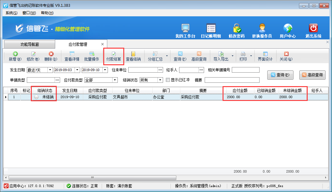 付款結算單單據審核之后,更新應付款的結銷狀態,在應付款管理界面可以查看應付款結銷情況,如下圖所示,供應商“文具超市”應付金額2000元,其中已結銷金額為1200元,未結銷金額為800元,單據結銷狀態為“部分結銷”,可以再次進行付款結算。