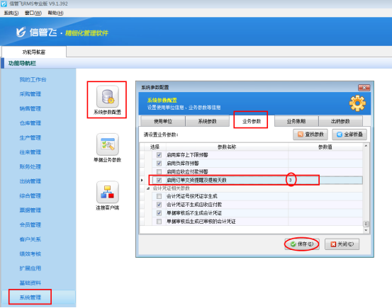 在功能導航窗點擊“系統管理”—》“系統參數配置”—》“業務參數”,打勾“啟用訂單交貨提醒及提前天數”,在參數值內可以錄入需要提前的天數,再保存設置,如下圖所示: