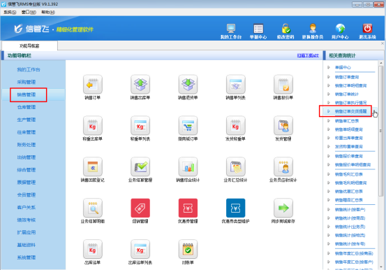 在功能導航窗點擊“銷售管理”,銷售管理模塊最右側相關查詢統計內打開“銷售訂單交貨提醒”,如下圖所示: