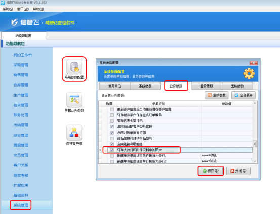 在功能導航窗點擊“系統管理”—》“系統參數配置”—》“業務參數”,打勾“訂單支持打印附件資料中的圖片”,保存設置,如下圖所示: