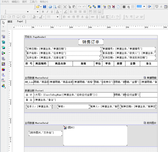 然后回到訂單界面,點擊“打印”—》“打印格式設計”—》“設計格式”,在打印模板上添加附件圖片數據項,如下圖所示: