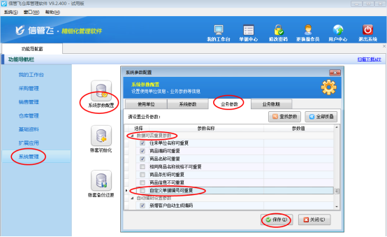 以信管飛倉庫管理軟件為例,在“系統(tǒng)管理”—》“系統(tǒng)參數(shù)配置”—》“業(yè)務(wù)參數(shù)”內(nèi)將“數(shù)據(jù)可否重復(fù)參數(shù)”中的“自定義單據(jù)編號(hào)可重復(fù)”參數(shù)的勾選取消,然后保存設(shè)置。如下圖1所示: