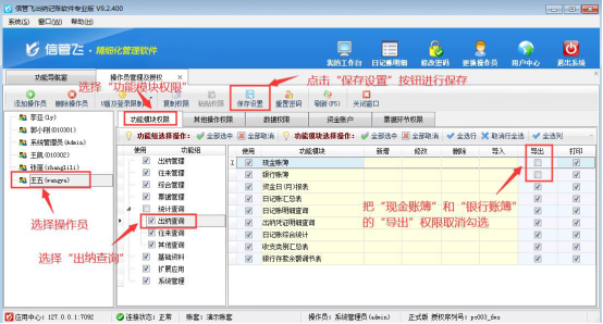 登錄軟件,在功能導(dǎo)航窗點擊“系統(tǒng)管理”—》“操作員及授權(quán)”,進入“操作員管理及授權(quán)”界面,選擇操作員“王五”,在其右側(cè)的功能模塊權(quán)限內(nèi)選擇“出納查詢”模塊,將現(xiàn)金賬簿和銀行賬簿的“導(dǎo)出”權(quán)限勾選取消,然后保存設(shè)置,如下圖所示: