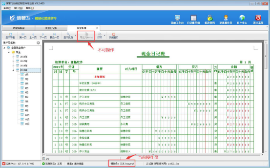 操作員權(quán)限設(shè)置完成后,使用操作員“王五”登錄軟件,點擊“出納管理”—》“現(xiàn)金賬簿”,打開現(xiàn)金賬簿界面,“導(dǎo)出為Excel”按鈕為灰色狀態(tài),不可操作,如下圖所示: