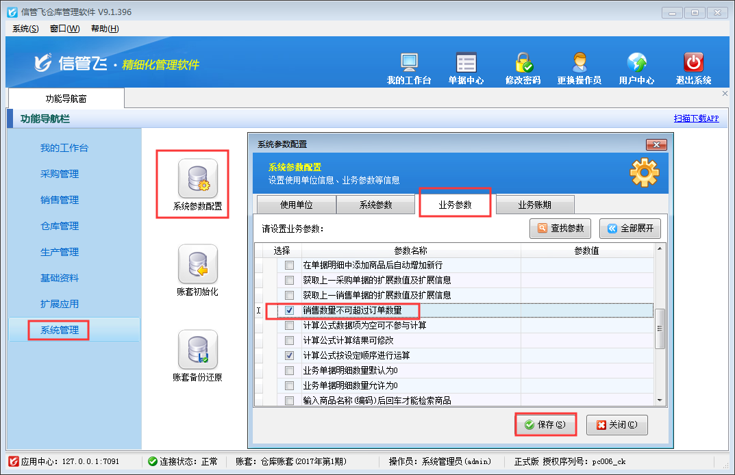 在功能導(dǎo)航窗點(diǎn)擊“系統(tǒng)管理”—》“系統(tǒng)參數(shù)配置”—》“業(yè)務(wù)參數(shù)”,即可進(jìn)入到“業(yè)務(wù)參數(shù)”界面,勾選“銷售數(shù)量不可超過訂單數(shù)量”參數(shù),然后點(diǎn)擊“保存”按鈕保存配置,如下圖所示。