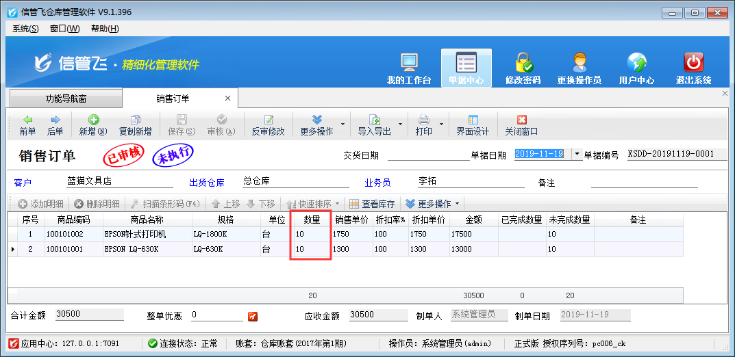 設(shè)置完之后,在功能導(dǎo)航窗點(diǎn)擊“銷售管理”—》“銷售訂單”,新增銷售訂單,添加兩條商品明細(xì),數(shù)量分別為10,然后保存并審核銷售訂單,如下圖所示。