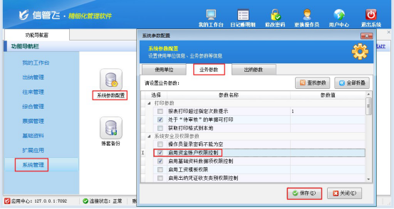 在功能導(dǎo)航窗選擇“系統(tǒng)管理”—》“系統(tǒng)參數(shù)配置”—》“業(yè)務(wù)參數(shù)”進(jìn)入業(yè)務(wù)參數(shù)配置界面,在系統(tǒng)安全及權(quán)限設(shè)置中勾選“啟用資金賬戶權(quán)限控制”參數(shù),如下圖所示: