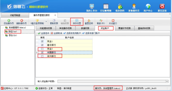 參數(shù)“啟用資金賬戶權(quán)限控制”啟用成功后,使用系統(tǒng)管理員登錄軟件,在功能導(dǎo)航窗選擇“系統(tǒng)管理”—》“操作員及授權(quán)”進(jìn)入操作員及授權(quán)管理界面,在權(quán)限模塊中可看到啟用的“資金賬戶權(quán)限”,添加操作員“張亞”,選擇操作員“張亞”后,打開資金賬戶權(quán)限,設(shè)置操作員“張亞”沒有“現(xiàn)金2和鄭州銀行”權(quán)限,保存設(shè)置,如下圖所示: