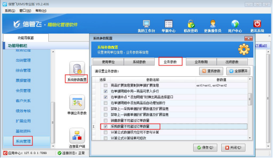 在功能導航窗點擊“系統管理”—》“系統參數配置”—》“業務參數”,即可進入到“業務參數”界面,勾選“采購數量不可超過訂單數量”參數,然后點擊“保存”按鈕保存配置,如下圖所示。