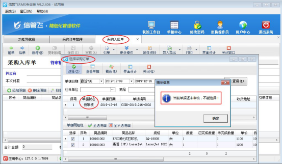 信管飛RMS軟件是集“采購管理、銷售管理、庫存管理、往來賬管理”一體的進銷存軟件,軟件可引用訂單生成對應(yīng)的采購入庫單和銷售出庫單。軟件默認引用訂單需要訂單處于審核狀態(tài),否則引用不了(如下圖所示),有的客戶存引用未審核的訂單,本文示范下如何設(shè)置?
