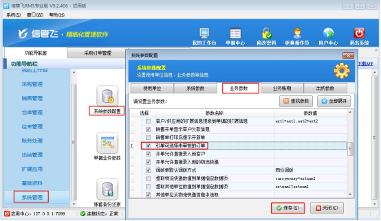 在功能導(dǎo)航窗點擊“系統(tǒng)管理”→“系統(tǒng)參數(shù)配置”→“業(yè)務(wù)參數(shù)”可以打開“業(yè)務(wù)參數(shù)”配置界面,在業(yè)務(wù)單據(jù)相關(guān)參數(shù)內(nèi)打鉤啟用“引單可選擇未審核的訂單”參數(shù),然后點擊“保存”按鈕保存設(shè)置,如下圖所示: