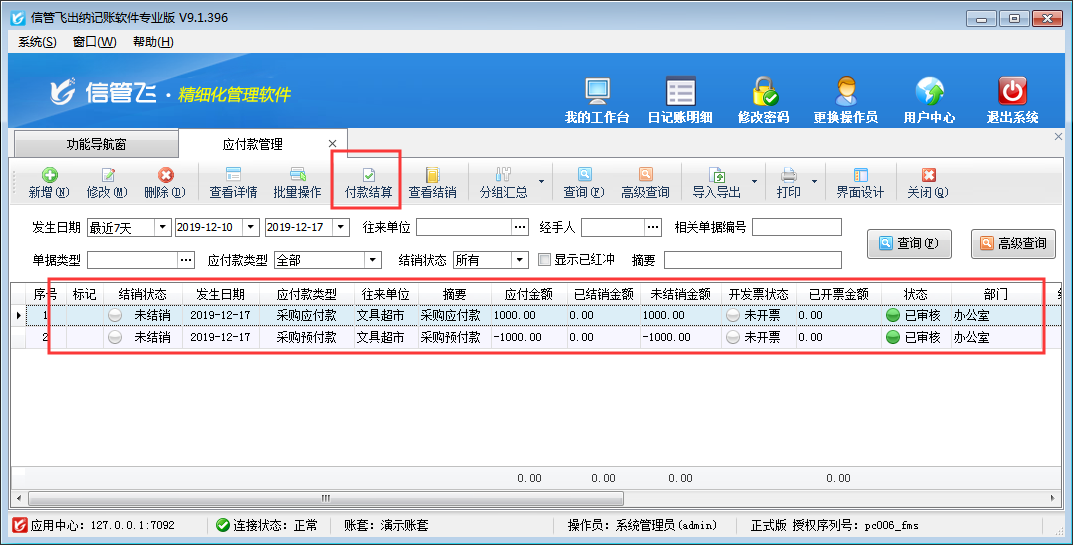 在應付款管理界面工具欄有“付款結算”按鈕,可以打開付款結算單對采購應付款/預付款進行付款結銷。如下圖所示,供應商“文具超市”應付金額1000元,采購預付款1000元,在單據明細“本次結銷金額”中,應付款輸入正數,預付款輸入負數,正負抵消,即可使用采購預付款沖銷應付款。