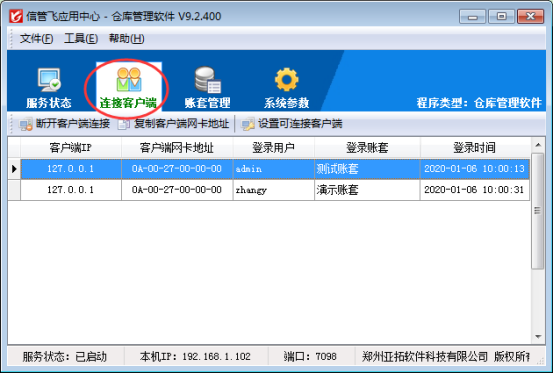 第一種方法:在信管飛倉(cāng)庫(kù)管理軟件應(yīng)用中心程序中查看已登錄軟件的連接客戶端。