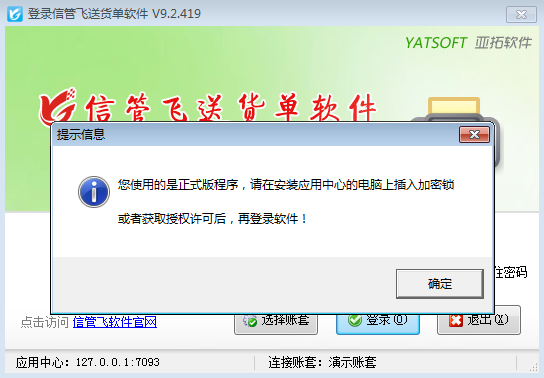 部分用戶有時在登錄軟件時會提示“您使用的是正式版程序,請在安裝應用中心的電腦上插入加密鎖或者獲取授權許可后,再登錄軟件!”,如下圖所示: