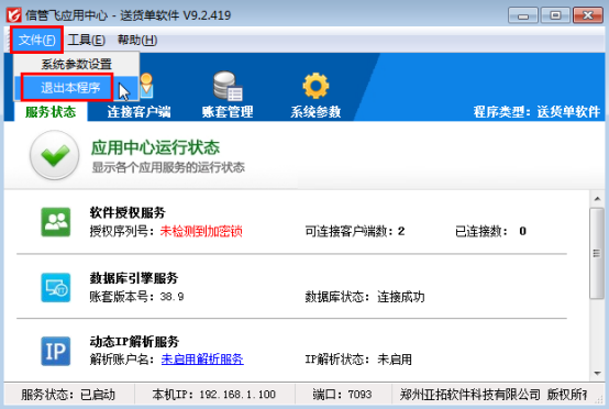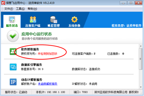 一、打開軟件應用中心程序(紅色圖標),可先查看服務狀態下的“軟件授權服務”,如果授權序列號顯示“未檢測到加密鎖”,如下圖所示: