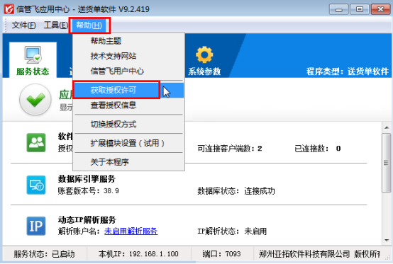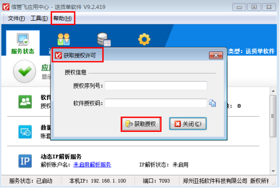 解決方法:請在應用中心程序中,點菜單“幫助”—》“獲取授權許可”,然后輸入購買的授權許可信息,點“獲取授權”即可。獲取授權成功后,請關閉應用中心程序,重新運行應用中心程序即可!如下圖所示: