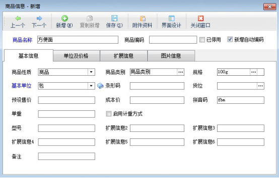 在“功能導(dǎo)航窗”點(diǎn)擊“基礎(chǔ)資料”—》“商品信息”,新增商品,錄入商品的基本信息(商品名稱及商品的基本單位等),如下圖所示: