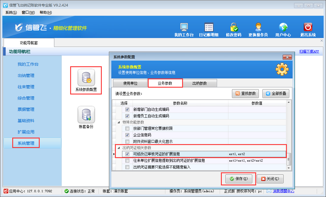 出納記賬軟件中默認(rèn)不允許直接修改已審核憑證的擴展信息,但是如需修改已審核憑證的擴展信息,系統(tǒng)支持參數(shù)配置,如下圖所示,啟用參數(shù):“可修改已審核憑證的擴展信息”,參數(shù)值可自定義,默認(rèn)為“ext1,ext2(擴展信息1,擴展信息2)”,參數(shù)啟用后即可修改已審核憑證的擴展信息,但是如需普通操作員可修改已審核憑證的擴展信息,需要另外設(shè)置一下操作員權(quán)限,本文介紹一下如何設(shè)置操作員可修改已審核憑證擴展信息的操作權(quán)限?