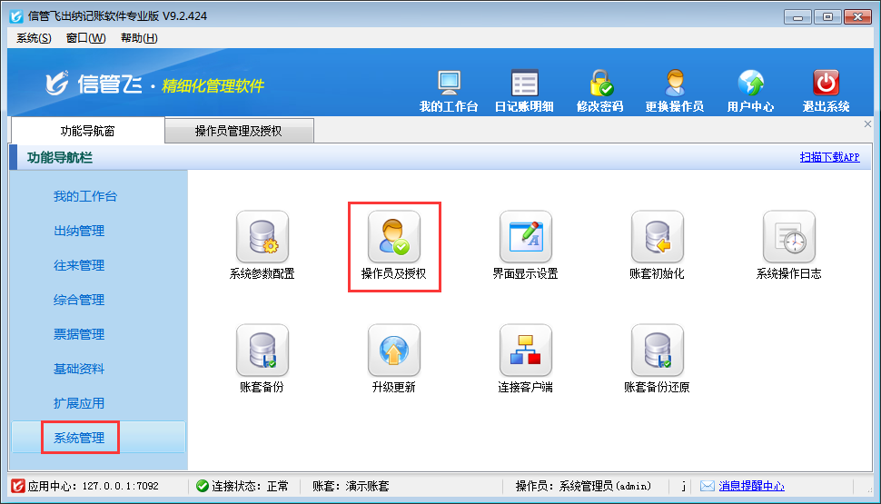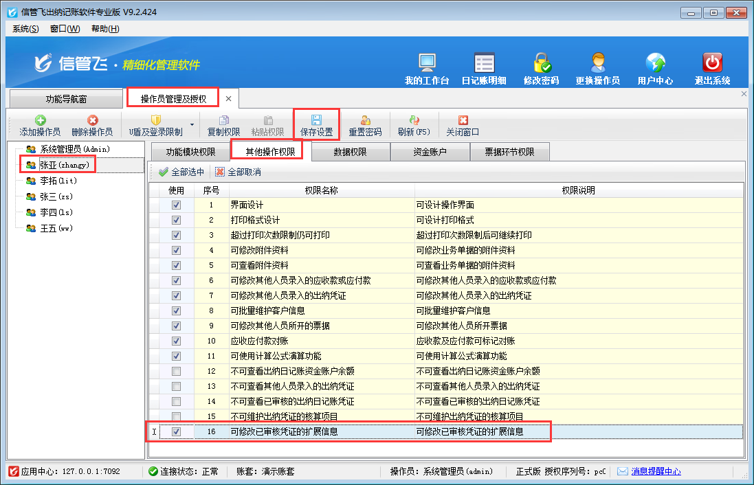 在功能導(dǎo)航窗點“系統(tǒng)管理”→“操作員及授權(quán)”即可進(jìn)入“操作員管理及授權(quán)”界面,選中操作員賬號,在“其他操作權(quán)限”界面將“可修改已審核憑證的擴展信息”權(quán)限勾選上,然后保存權(quán)限設(shè)置即可。如下圖所示,設(shè)置操作員賬號“張亞”可修改已審核憑證的擴展信息。