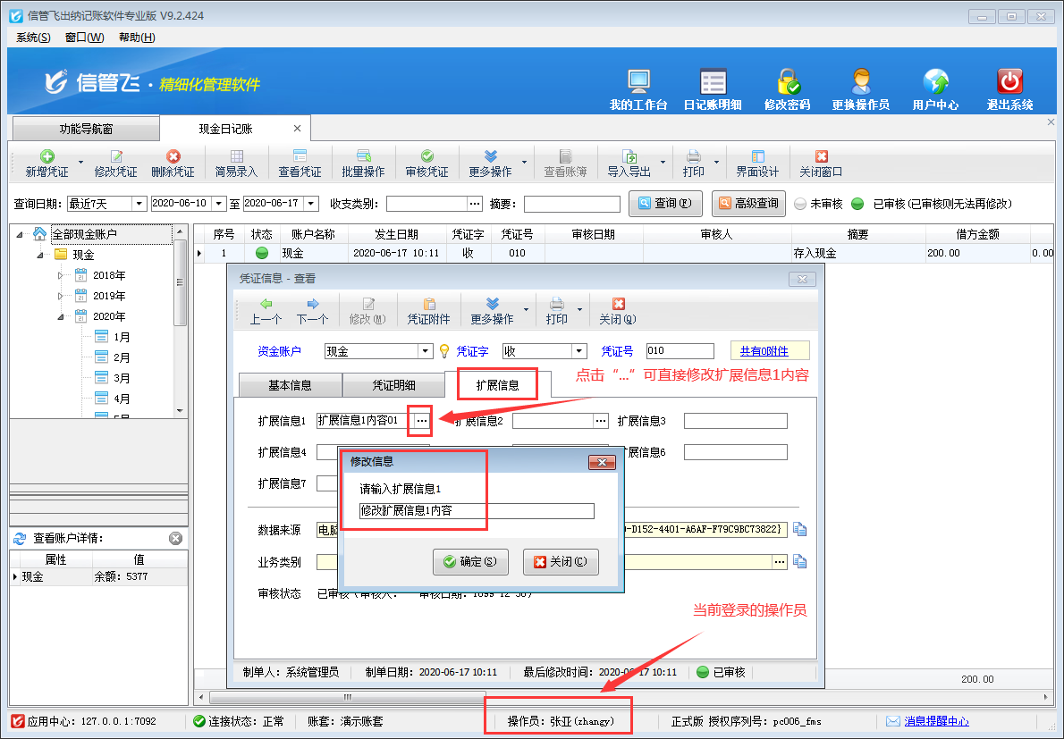 設(shè)置完成之后,我們使用操作員賬號“張亞”登陸軟件,然后在功能導(dǎo)航窗點擊“出納管理”→“現(xiàn)金日記賬”,打開一個已審核的現(xiàn)金日記賬憑證,然后點擊擴展信息頁面,在“擴展信息1”后的“...”按鈕可以直接修改擴展信息內(nèi)容,如下圖所示: