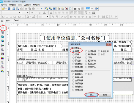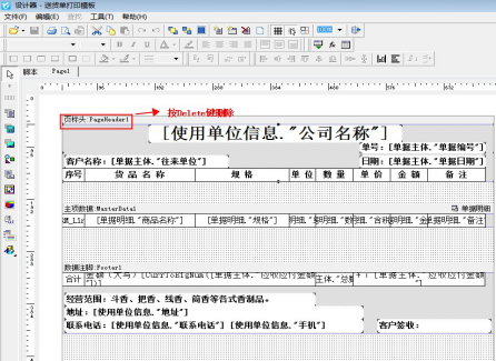 打開已開送貨單界面,在工具欄點擊打印—》打印格式設(shè)計進入打印格式設(shè)計界面,選擇模板點擊“設(shè)計格式”,進入模板設(shè)計器界面,在模板設(shè)計器中,單擊頁標頭,按Delete鍵刪除頁標頭,然后左邊工具欄點擊“插入邊框”,在表頭處插入“標題”,然后往下拖動,覆蓋所有表頭內(nèi)容,保存模板即可。如下圖所示: