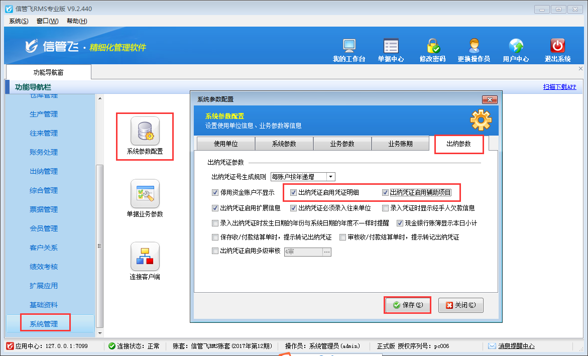 信管飛出納記賬軟件、信管飛RMS(標(biāo)準(zhǔn)版、專業(yè)版)中的出納管理模塊,在新增憑證中有的需要填寫輔助項(xiàng)目和憑證明細(xì),軟件支持設(shè)置在新增憑證時(shí)顯示這些項(xiàng)目。下邊以信管飛RMS為例,演示一下如何設(shè)置出納憑證啟用憑證明細(xì)和輔助項(xiàng)目。