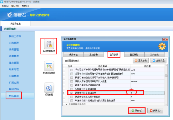 在功能導航窗點擊“系統(tǒng)管理”—》“系統(tǒng)參數(shù)配置”—》“業(yè)務參數(shù)”,即可進入到“業(yè)務參數(shù)”界面,在業(yè)務單據(jù)相關參數(shù)內,勾選“銷售單允許多窗口開單”參數(shù),參數(shù)值內錄入需要銷售單的窗口數(shù),然后點擊“保存”按鈕保存配置,如下圖所示: