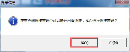出現(xiàn)授權(quán)達(dá)到最大用戶數(shù)提示后,點擊“確定”按鈕,可以看到提示信息“在客戶端連接管理中可以斷開已有連接,是否進(jìn)行連接管理”,點擊是進(jìn)入下一選擇,如下圖所示: