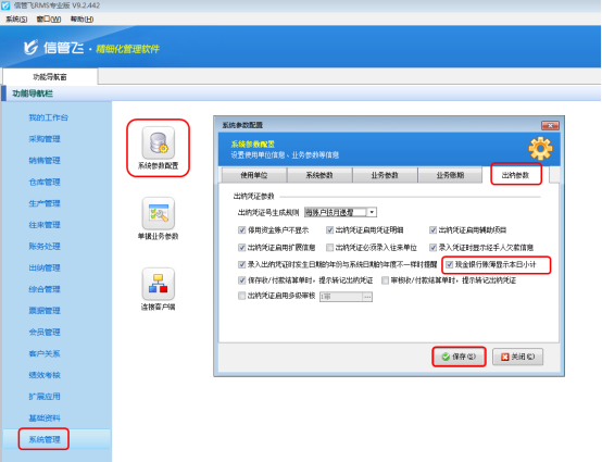 在功能導(dǎo)航窗點(diǎn)擊“系統(tǒng)管理”——》“系統(tǒng)參數(shù)配置”即可打開“系統(tǒng)參數(shù)設(shè)置”界面,點(diǎn)擊“出納參數(shù)”,系統(tǒng)默認(rèn)勾選“現(xiàn)金銀行賬簿顯示本日小計(jì)”參數(shù),如圖1所示。