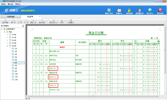 系統(tǒng)進(jìn)入“現(xiàn)金賬簿”窗口,在窗口左側(cè)的導(dǎo)航樹中,所有現(xiàn)金帳戶可以按年按月顯示帳簿信息,我們點(diǎn)擊查看2020年6月的現(xiàn)金賬簿信息,如圖3所示,這是現(xiàn)金賬簿顯示本日小計(jì)的效果圖。